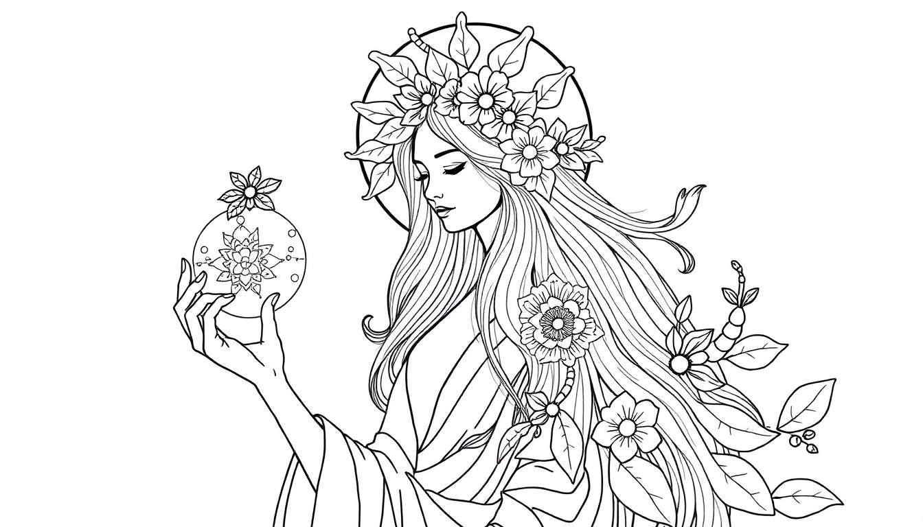 Una detallada página para colorear en blanco y negro que presenta a una mujer etérea con una corona de flores y hojas, sosteniendo una esfera transparente con un diseño floral intrincado en su interior. Ideal para adultos y niños que buscan una actividad relajante y creativa.