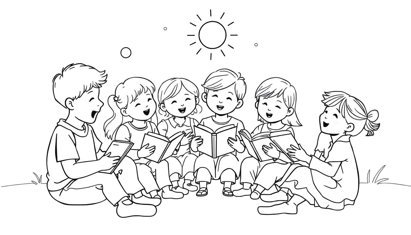 Esta página para colorear captura un momento de pura alegría y aprendizaje al aire libre. Seis adorables niños, una mezcla de niños y niñas, están sentados en un círculo acogedor, cada uno con un libro abierto en sus manos. Sus expresiones faciales son contagiosas: amplias sonrisas y bocas abiertas que insinúan risas compartidas o un entusiasmo desbordante por las historias que están descubriendo. Es una escena que evoca la magia de la lectura y la camaradería infantil, todo ello bañado por el cálido resplandor de un sol radiante, con la sugerencia de hierba fresca bajo sus pies.
